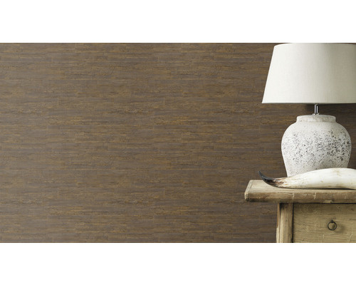 Rasch vliesbehang met houtlook in warme bruin/roesttinten.