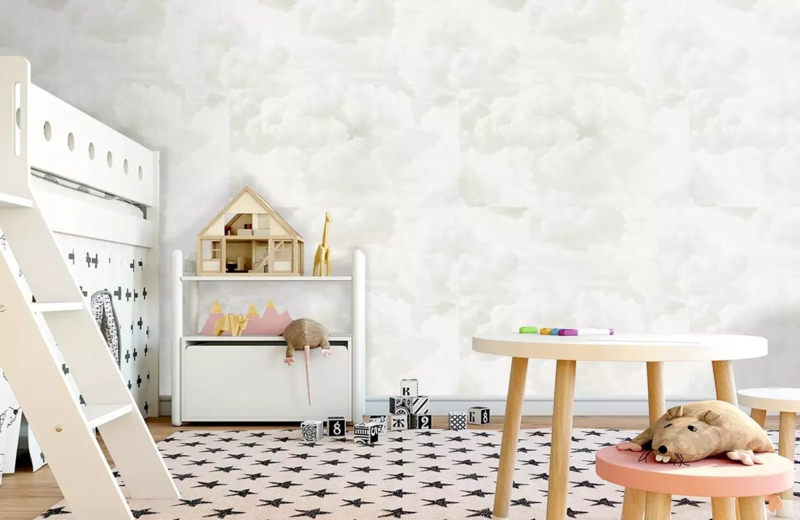 Rustgevend wolkenpatroon – Zacht wolkenmotief in grijs en wit voor een rustige en landelijke uitstraling.