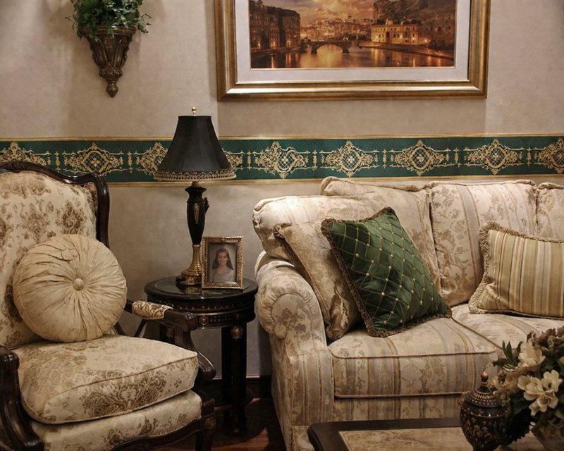 Stel je een warme, elegante woonkamer voor met een licht beige of crème muur. Deze groen-gouden behangrand loopt horizontaal door de ruimte, ongeveer op ooghoogte of net boven een lambrisering.