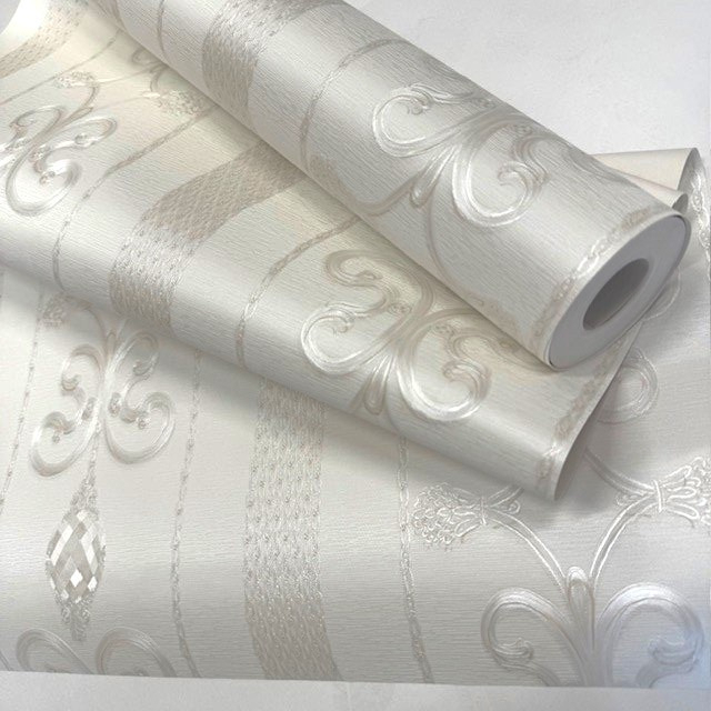 Ornamnten behang beige wit 3D effect barok glim∙ Afmetingen: 10M lang x 53CM breed